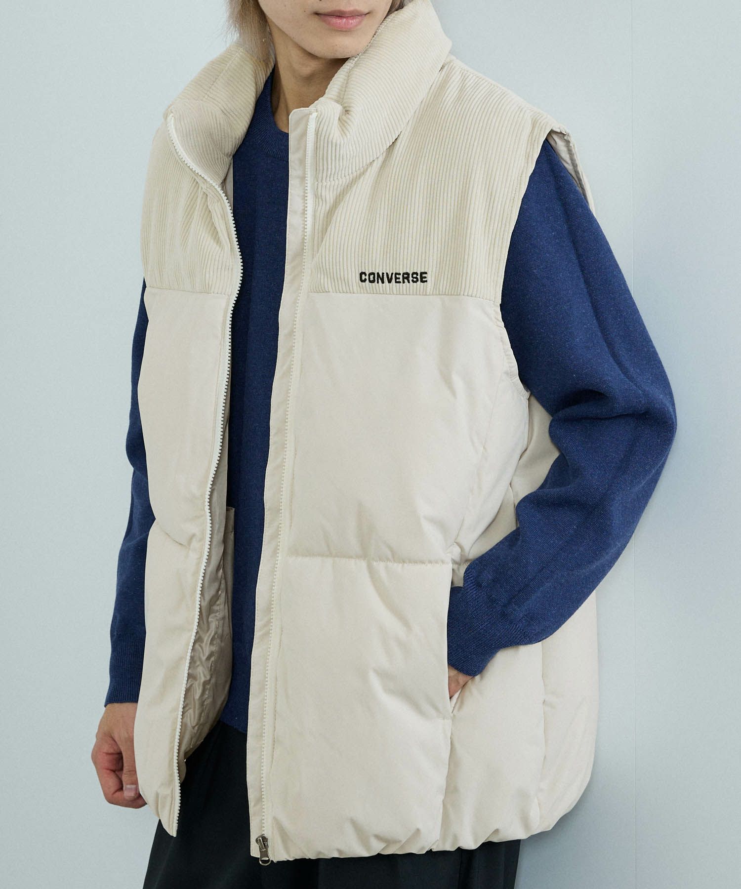 「CONVERSE」から、コーデュロイ切り替え中綿ベストの登場です。