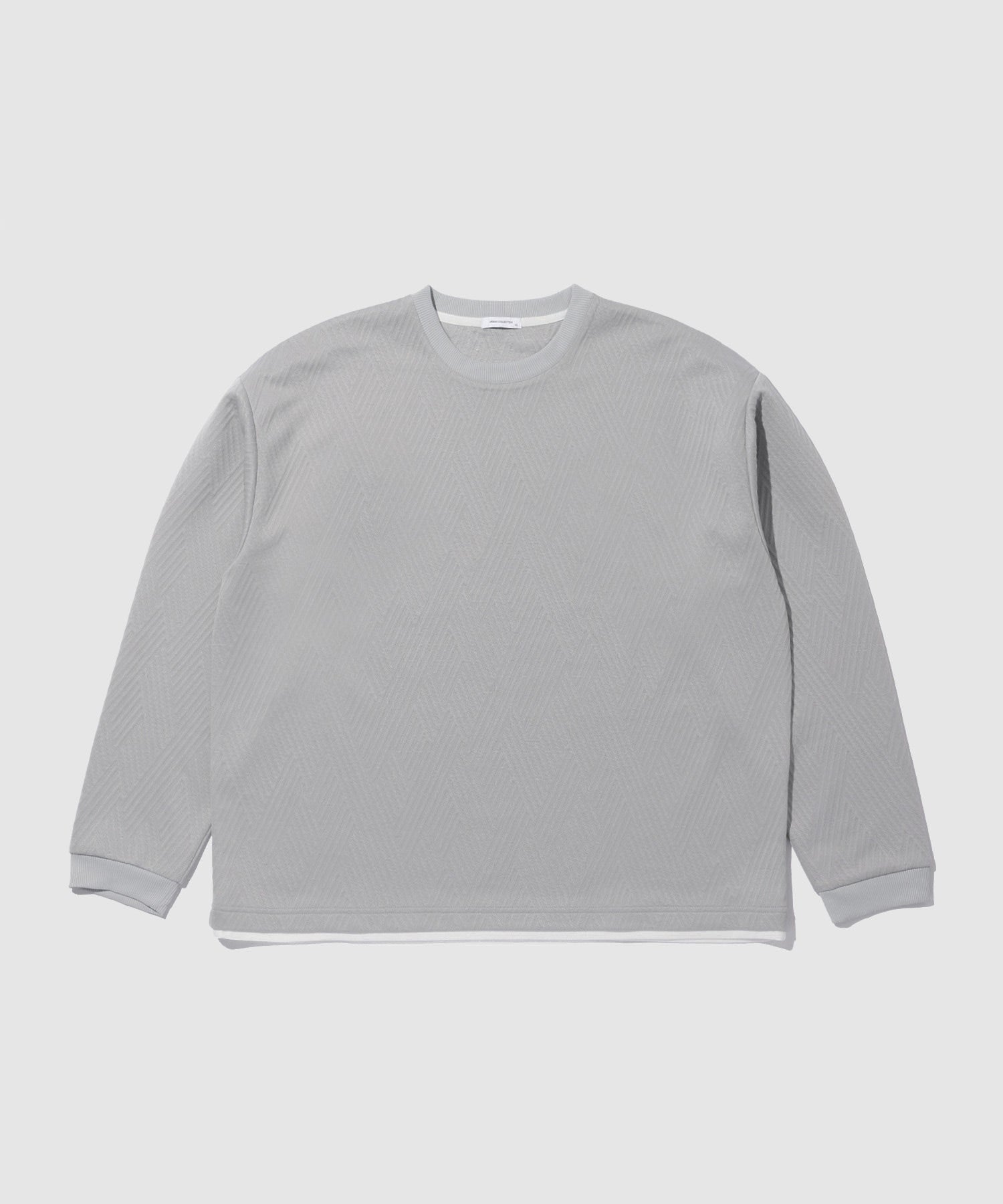 首元はフェイククルーネック仕様で、さりげないレイヤード調のディテールが洗練された印象を与えます。