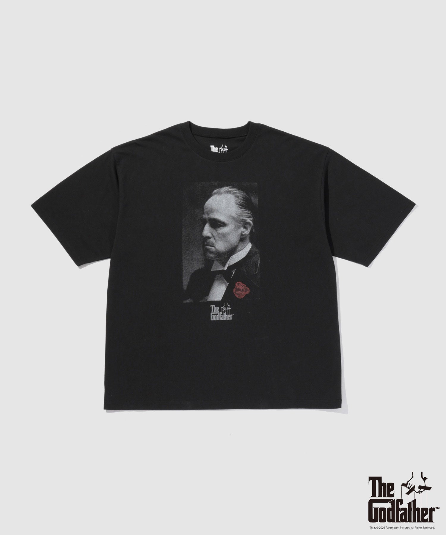 モノクロの『ゴッドファーザー』フォトに赤のアクセントが映える、印象的なオーバーシルエットTシャツです。