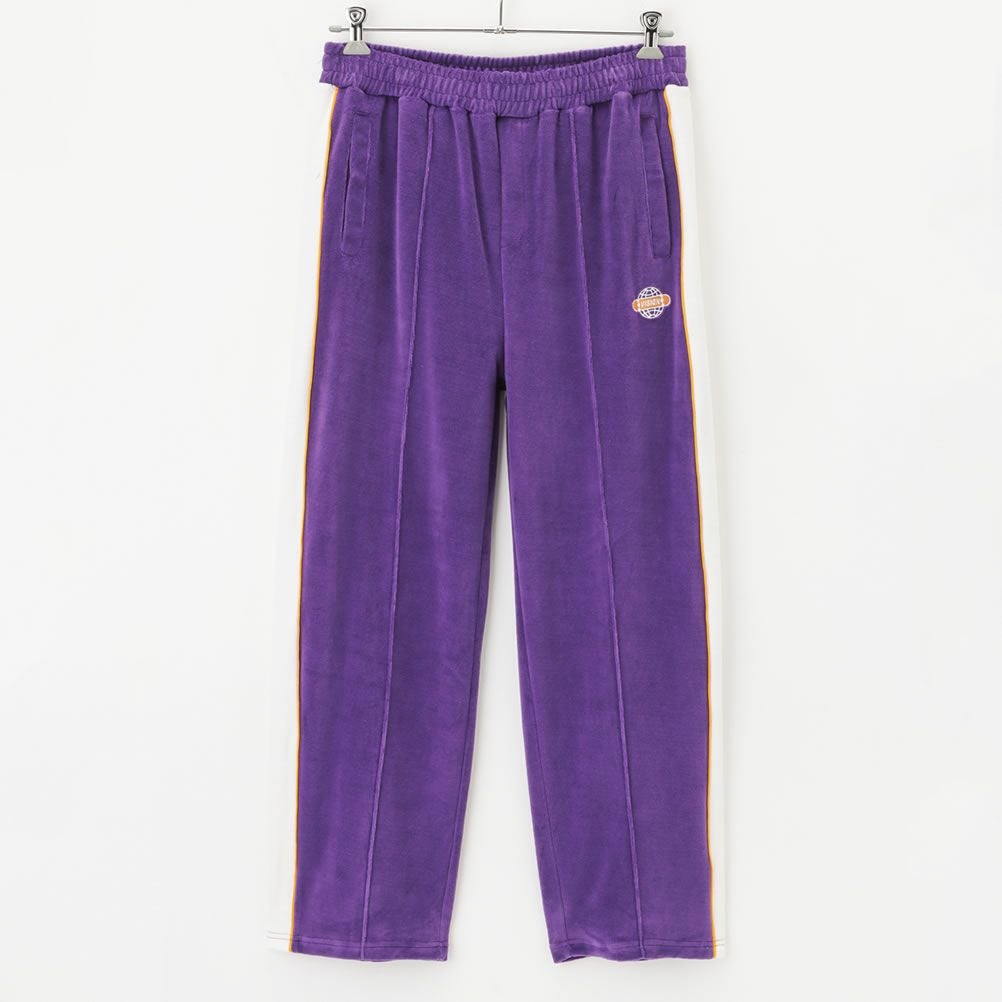 ヴィジョンストリートウェア ジョガーパンツ ベロア素材 トラックパンツ ジャージ サイドライン ワンポイント刺繍 ネームタグ ポケット ウエストゴム 紐 ロングパンツ