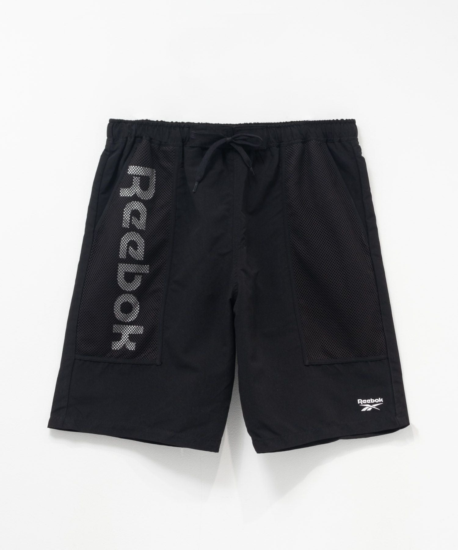 リーボック ショートパンツ サーフトランクス 水着 水陸両用 メッシュインナー付き 耐塩素加工 ポケット ウエストゴム 紐 ロゴ プリント 黒 膝上 膝丈 短パン プール 海