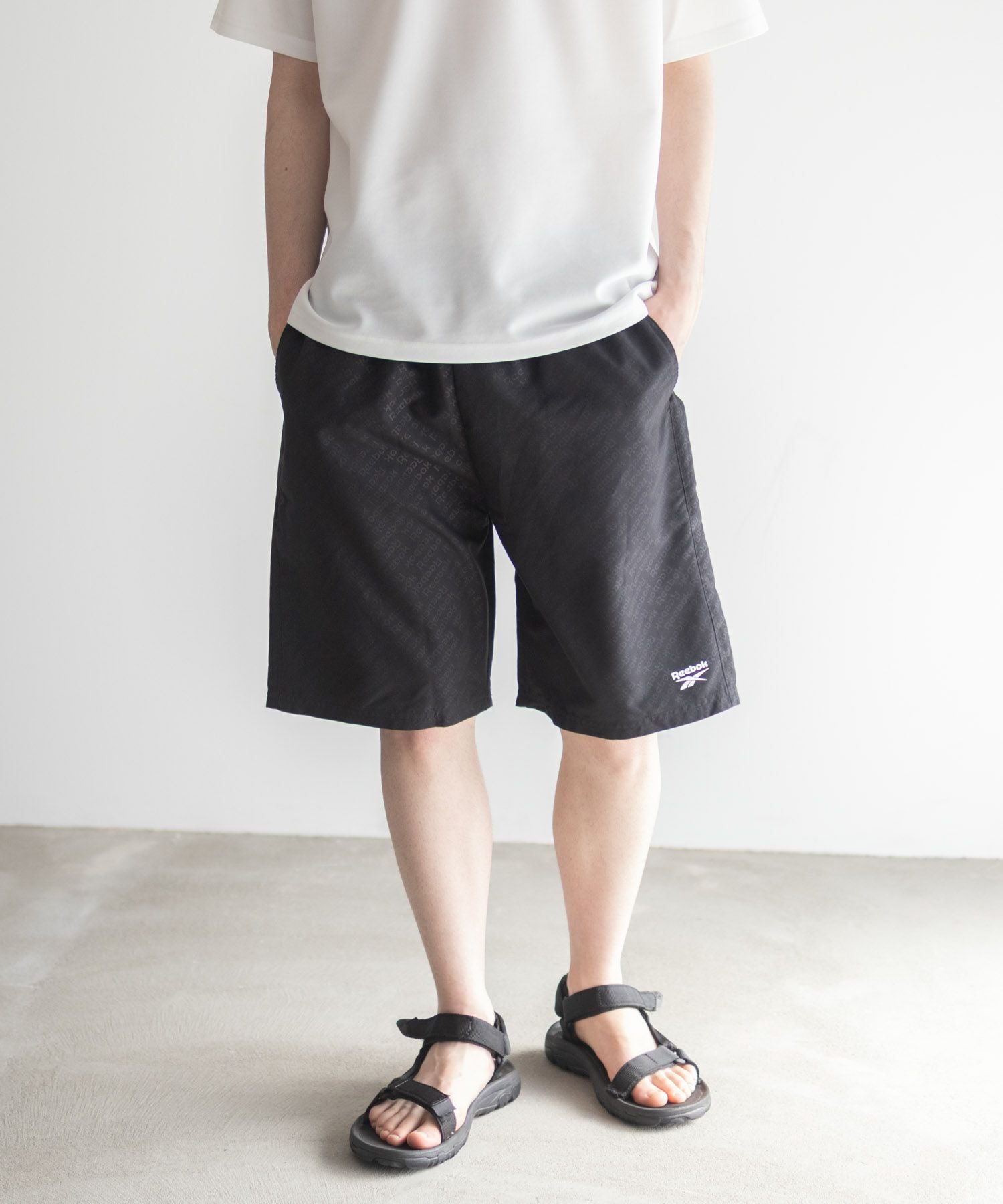 リーボック ショートパンツ サーフトランクス 水陸両用 インナー付き 耐塩素 ウエスト紐 ポケット ロゴ プリント 黒 膝上 膝丈 短パン プール 海