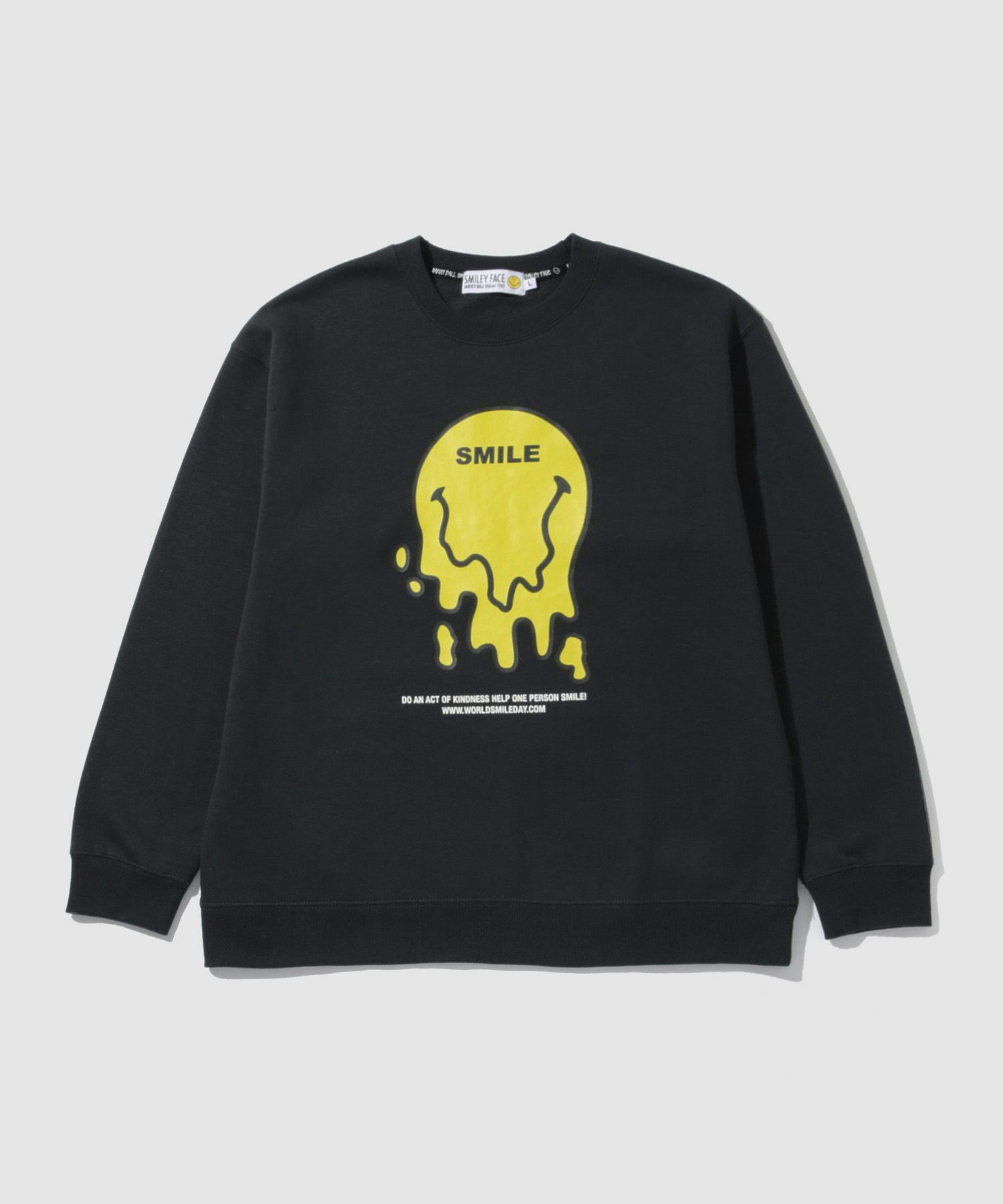 スマイリーフェイスを大胆にプリントした、インパクトのある裏起毛トレーナー。