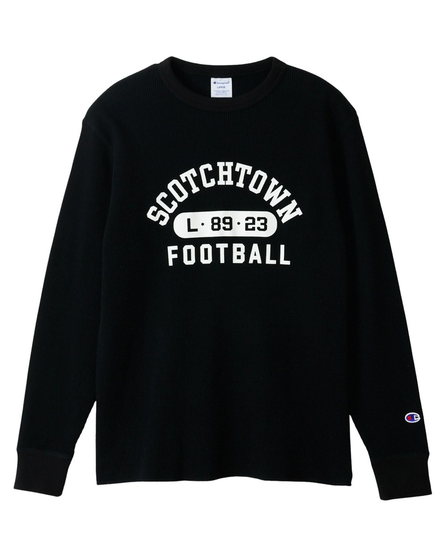 チャンピオン 長袖Tシャツ ロンT ワッフル素材 綿混 カレッジプリント ロゴ ワッペン 白 黒 クルーネック バインダーネック カットソー ユニセックス レディース