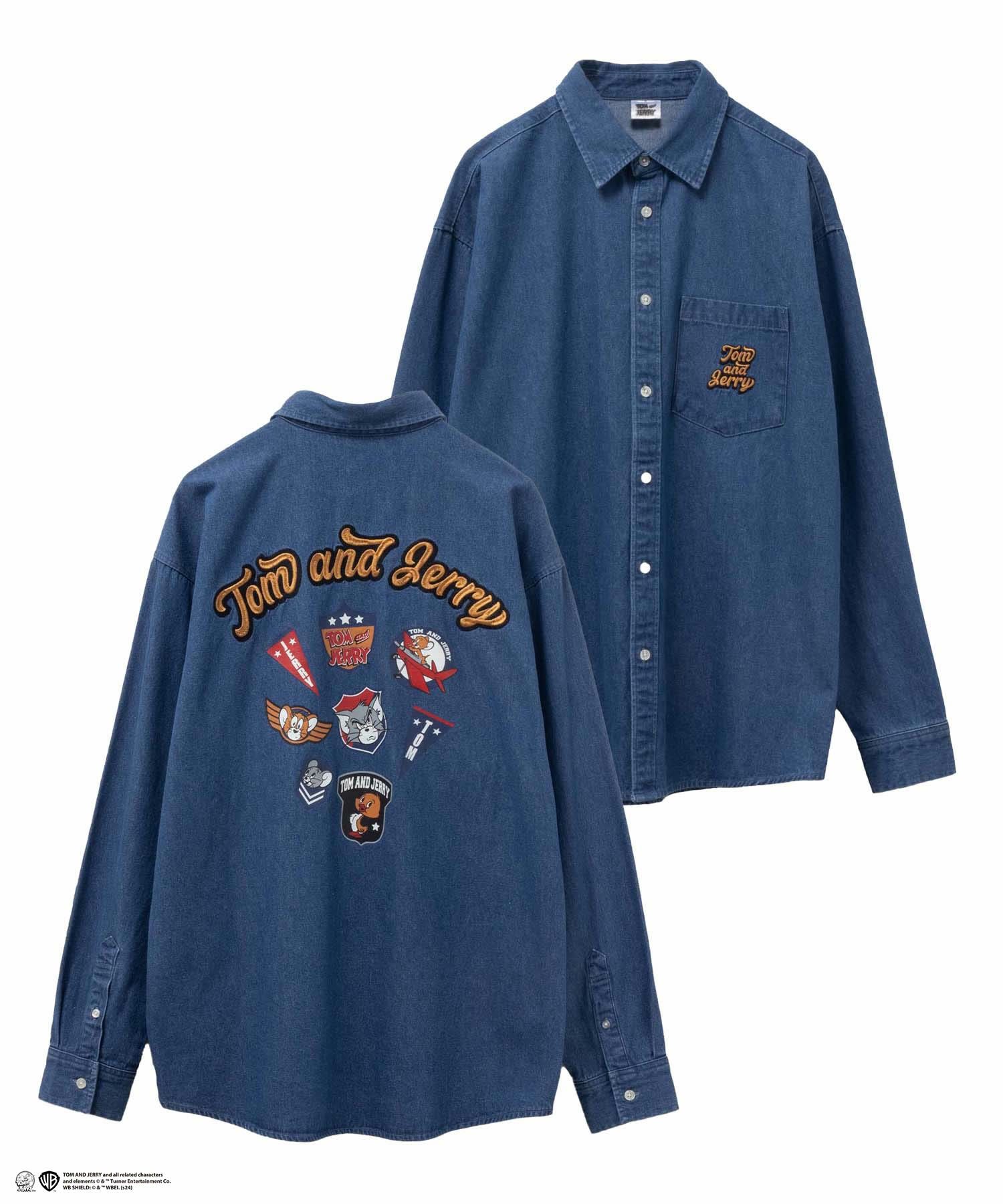 ワッペン風にキャラクター要素をちりばめた「トムとジェリー」のデニムシャツです。