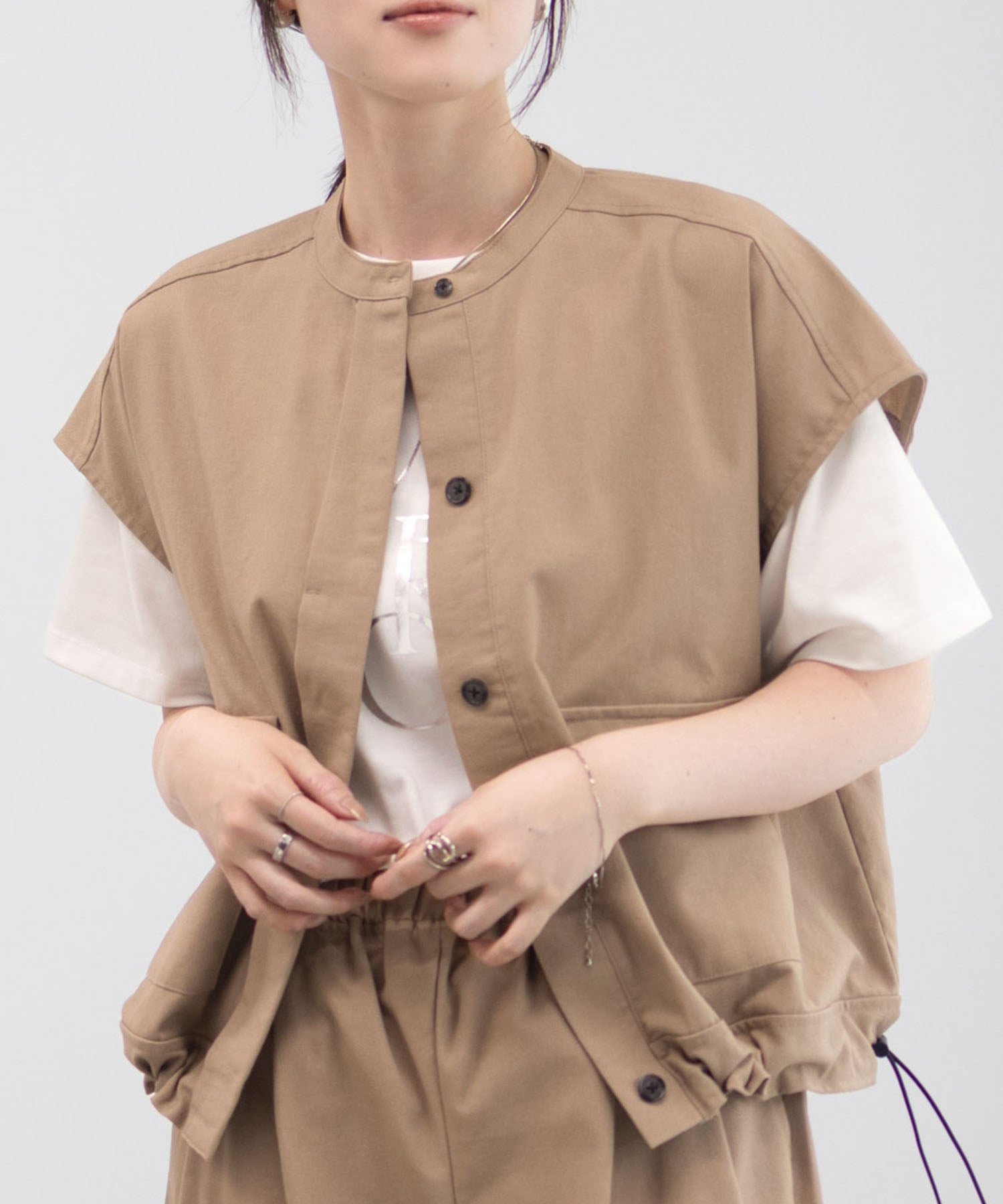 ベストのように着られるノースリーブジャケット。