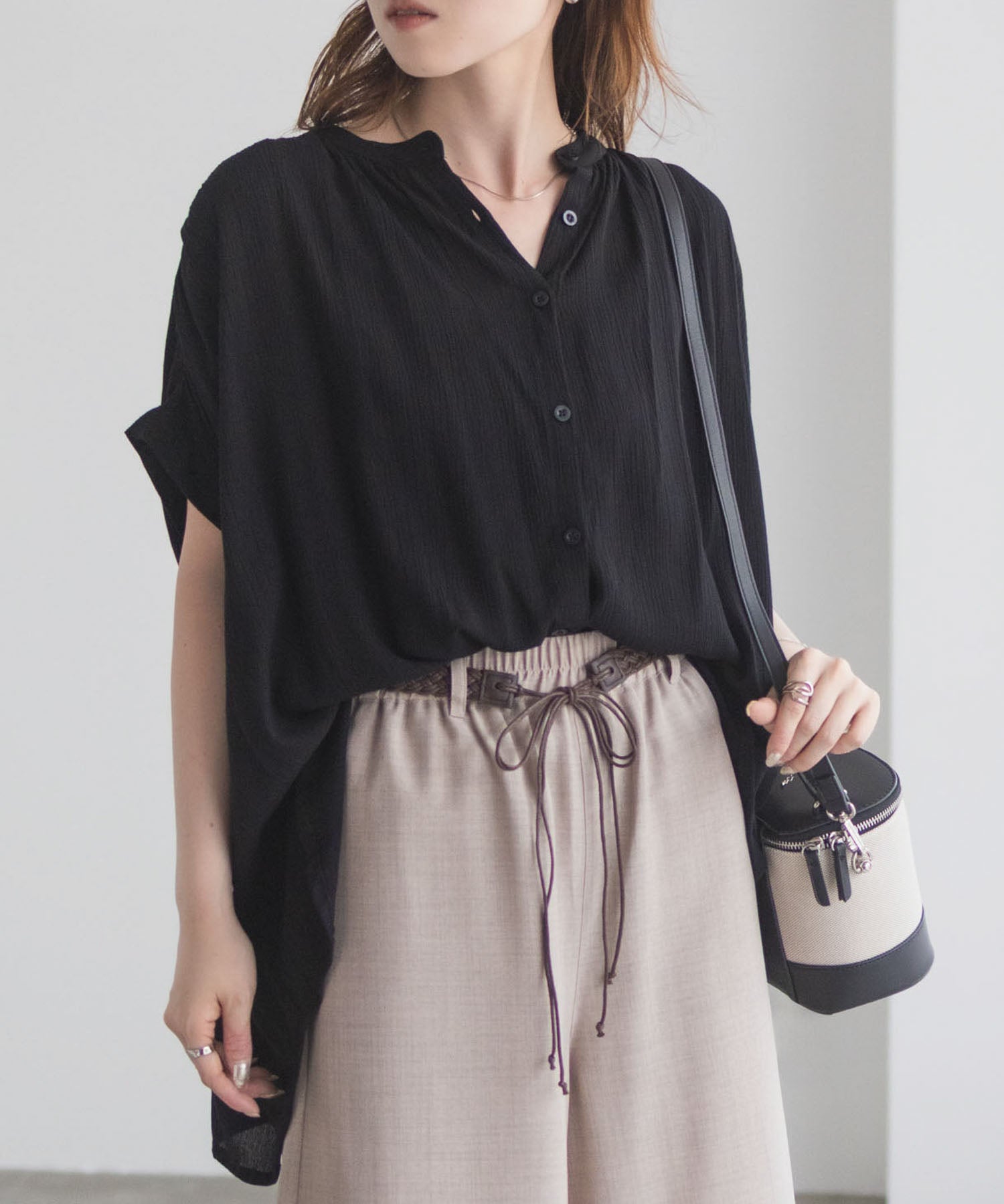 ロングスカートやワイドパンツと合わせるだけで、品の良いリラックススタイルが完成。