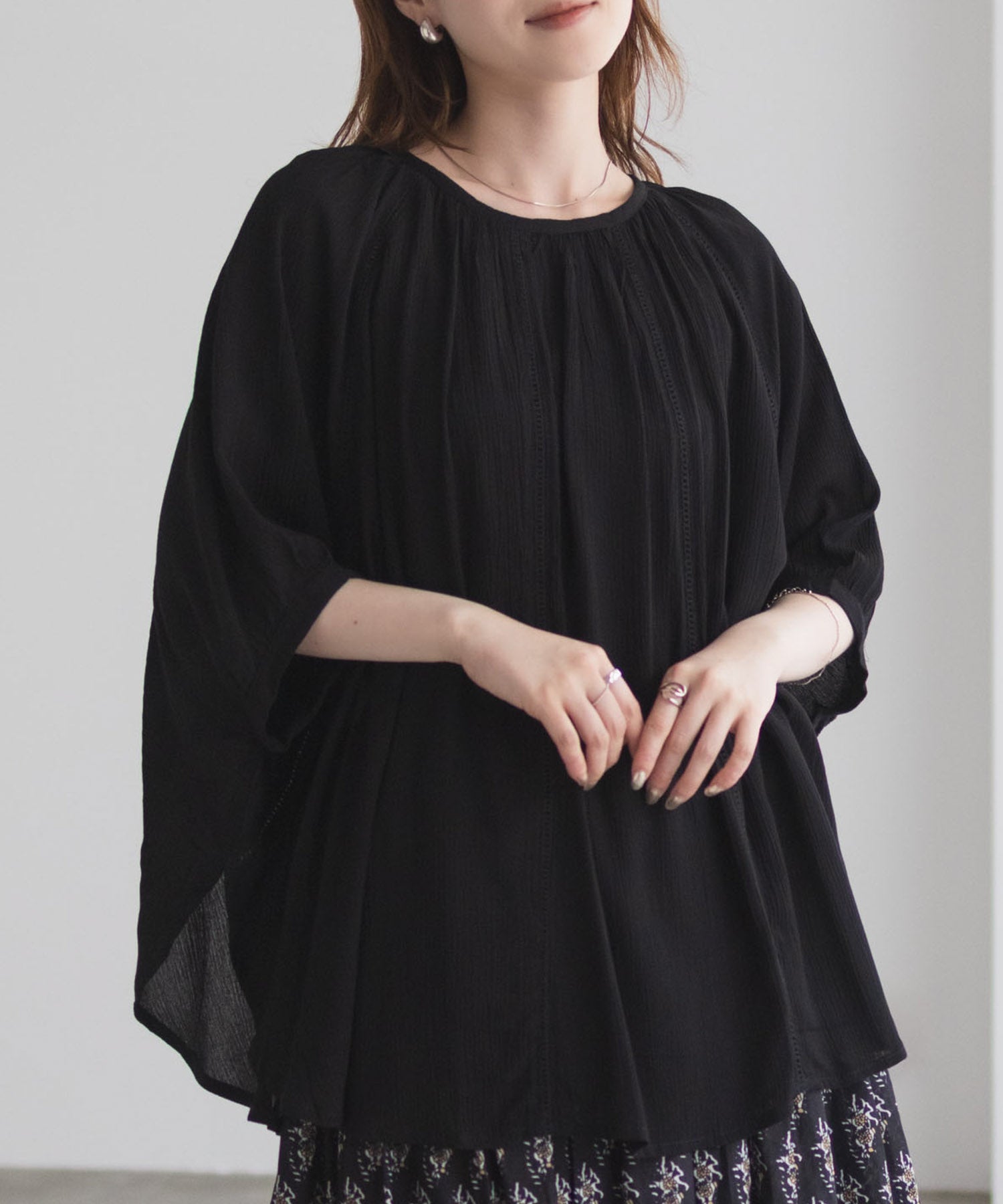 ハウディーマリー ブラウス 五分袖 半袖 ドルマンスリーブ ゆったり UVカット レーヨン 通気性 ハシゴレース 黒 ラウンドヘム カジュアルシャツ