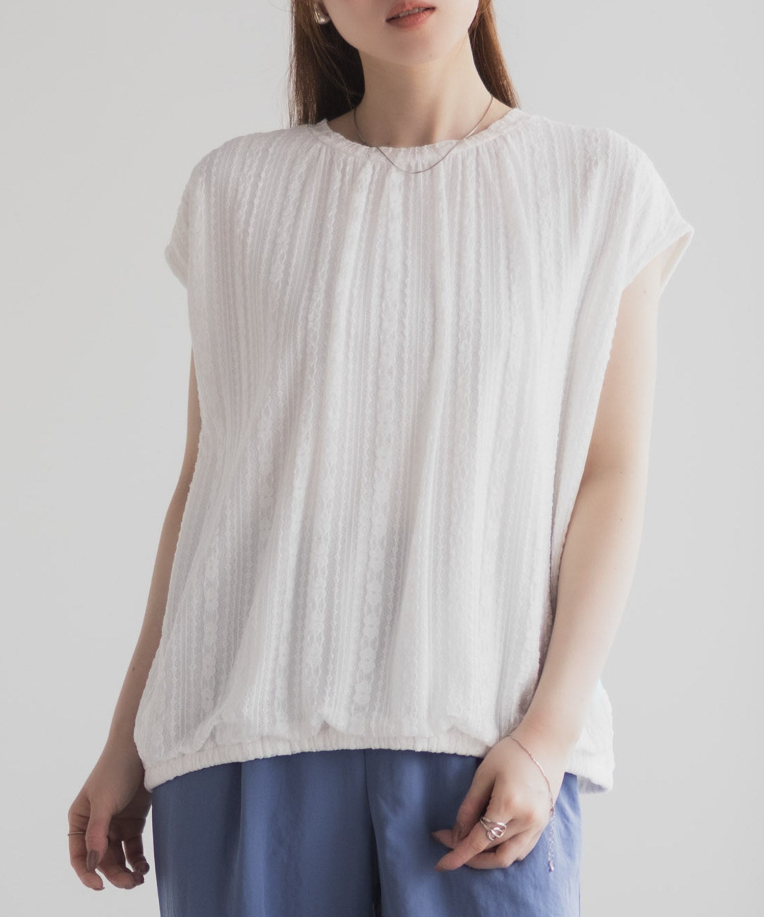 ストレッチレースとカットソーのコンビネーションで、リラックスして着用できます。
