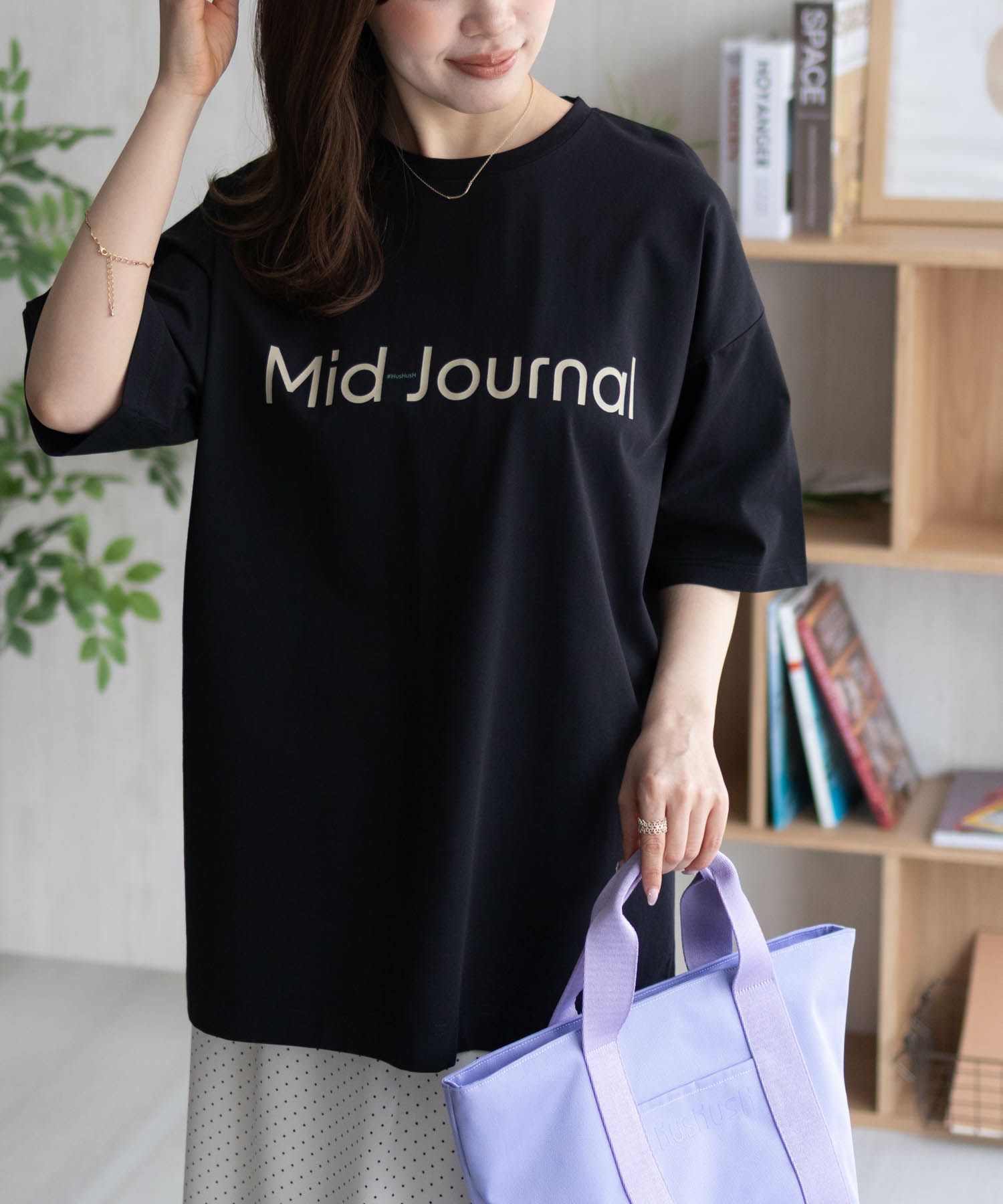 オーバーサイズTシャツ+シンプルロゴで使いやすいアイテム。