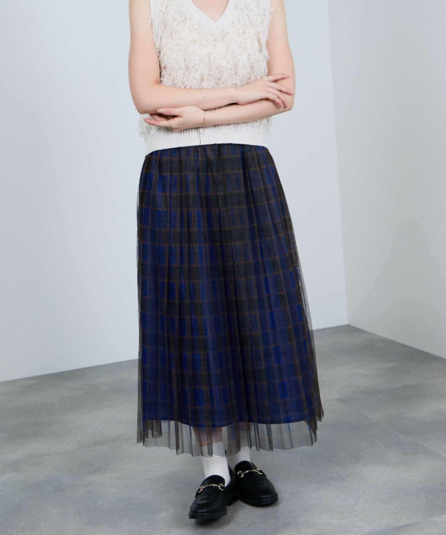 イドネス フレアスカート チュール ウエストゴム 裏地付き チェック柄 ロングスカート