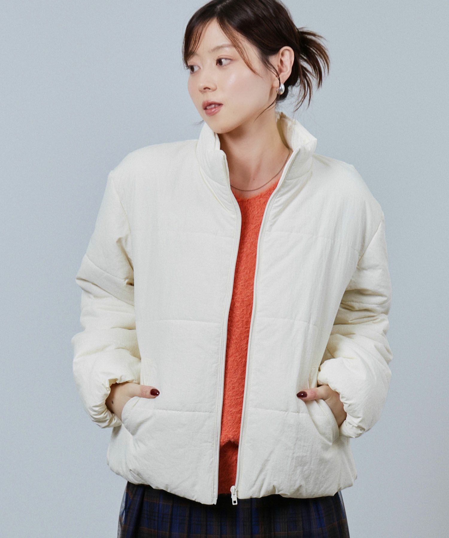 暖かく軽い、中綿スタンドネックブルゾン。