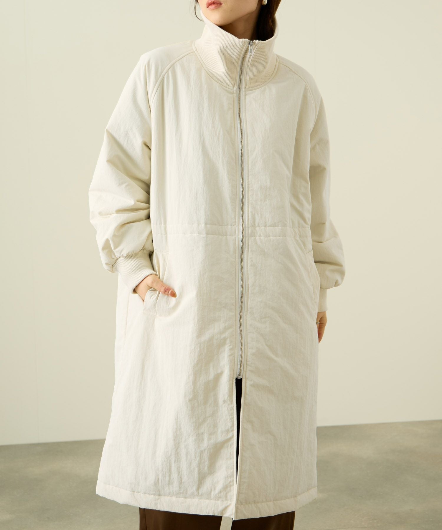 大きめのリブスタンドカラーが印象的なロング中綿コート。