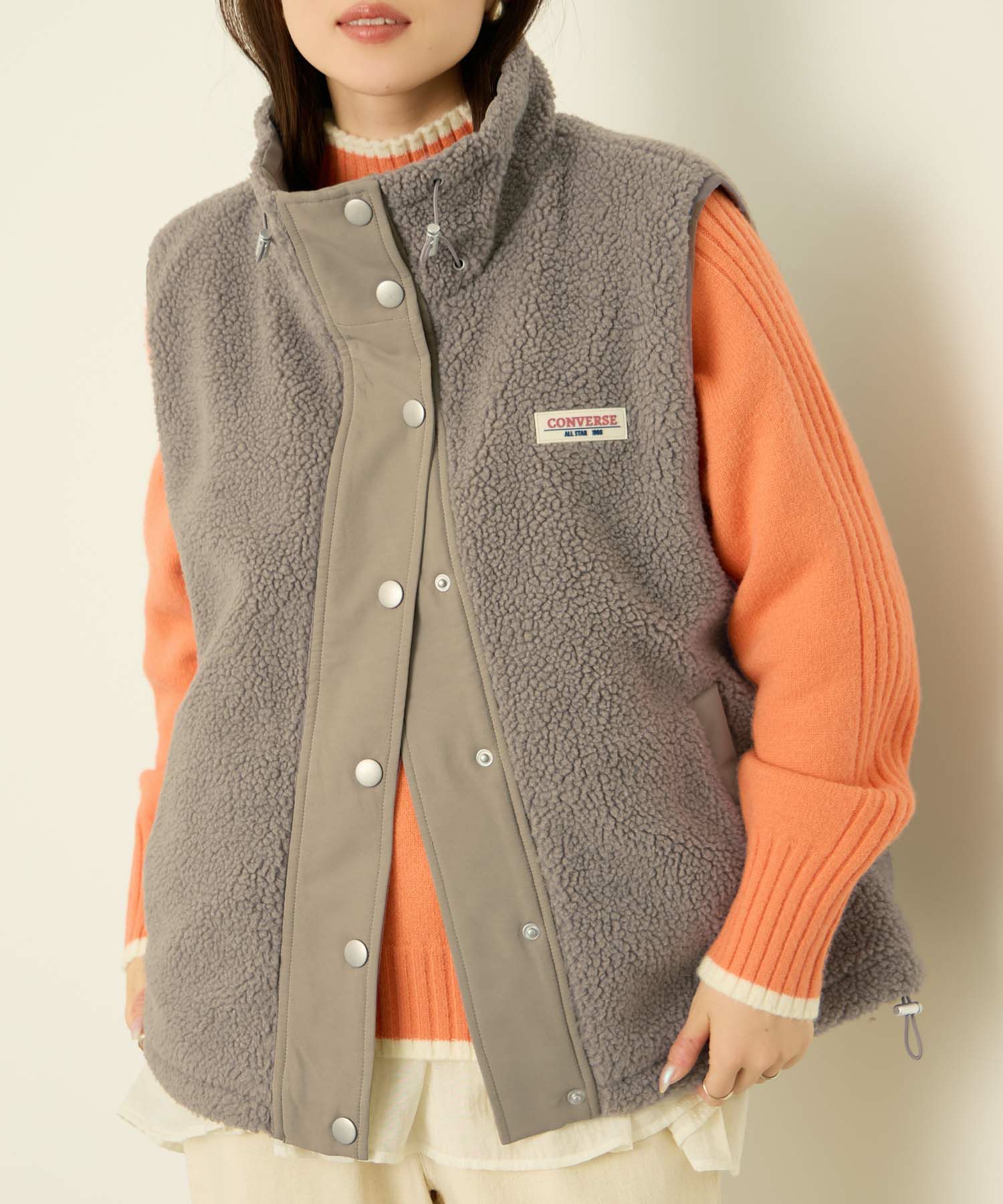 コンバース ボアベスト ポケット ドローコード ロゴ 白 もこもこ あったか 暖かい 前開き スナップボタン