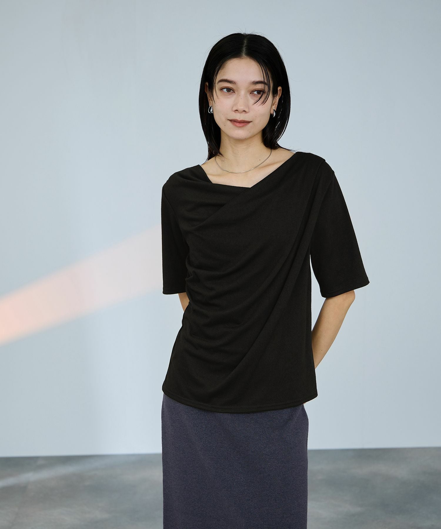 なめらかな落ち感と、顔まわりを華やかに見せてくれるドレープネックが、一枚で着映えするデザインカットソー。
