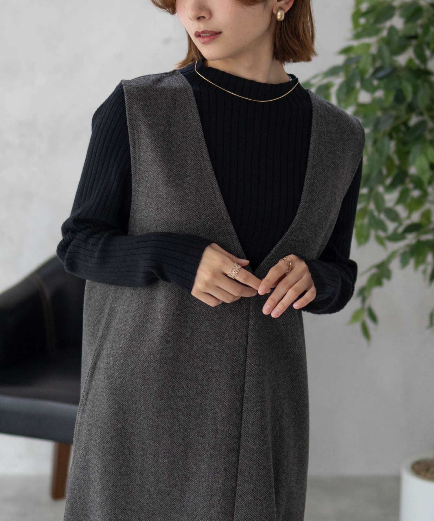 ハウディーマリー ジャンパースカート ポンチ素材 ポケット スリット ヘリンボーン ツイード 無地 Vネック 膝下丈 ミモレ丈 ジャンスカ