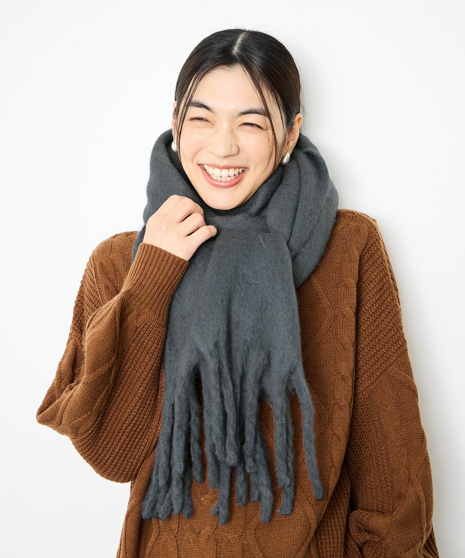 あたたかみのある素材感が首に巻くだけでなく、肩掛けのスタイリングでも包み込まれる雰囲気で可愛さアップ。