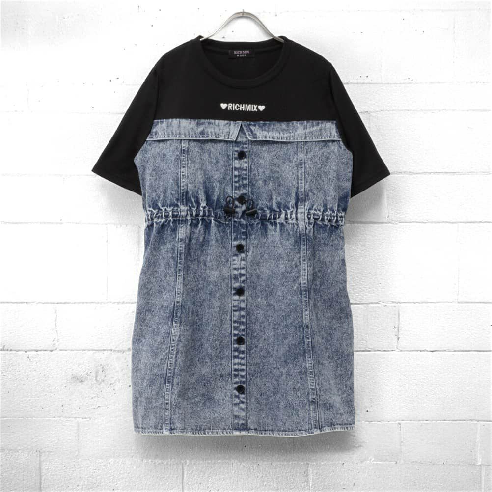 リッチミックス ワンピース 半袖 子供服 女の子 ガールズ デニム チェック柄 ドローコード ロゴ刺繍 ポケット フェイクレイヤード