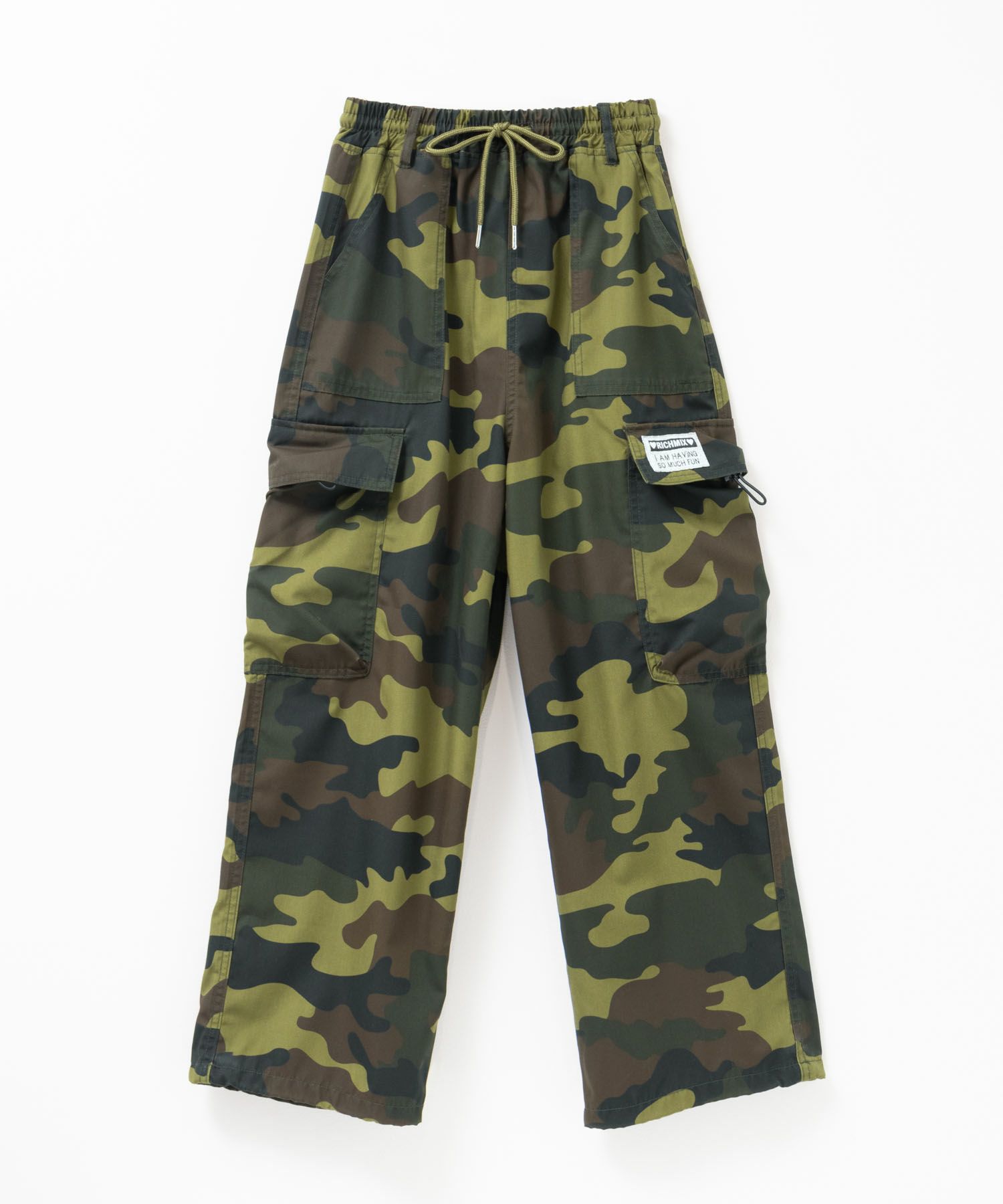 トレンドの迷彩柄プリントのカーゴパンツ。