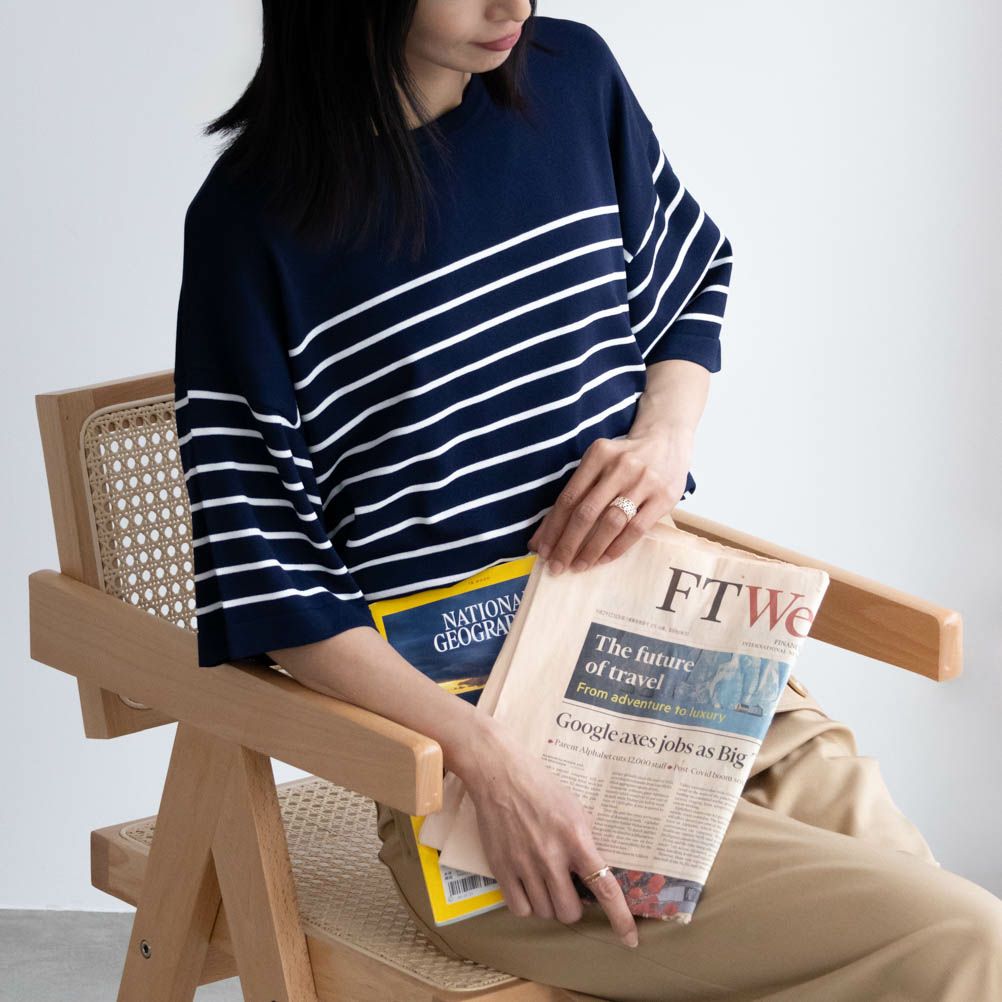 体の線をひろいにくく、清潔感のあるきれいめな表面感が特徴のニット。