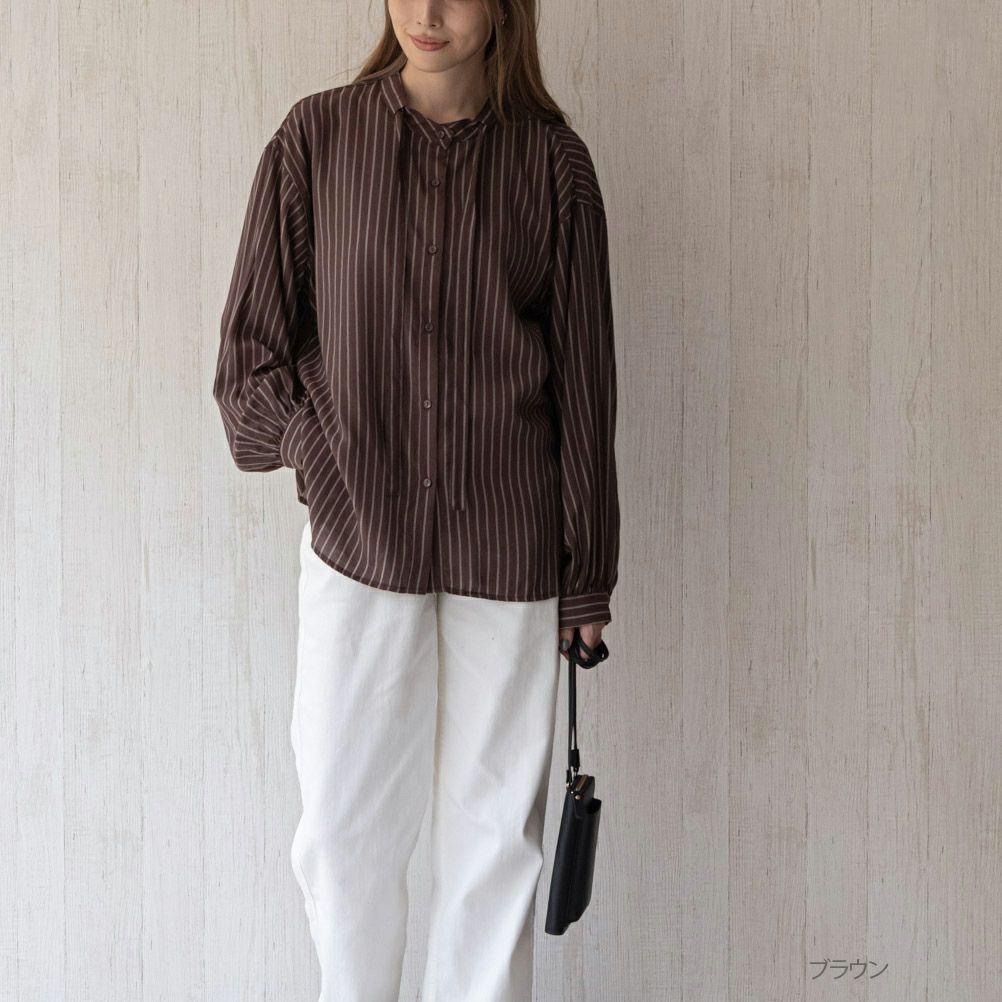 ほんのり透け感のある涼やかなリボン付きシャツ。