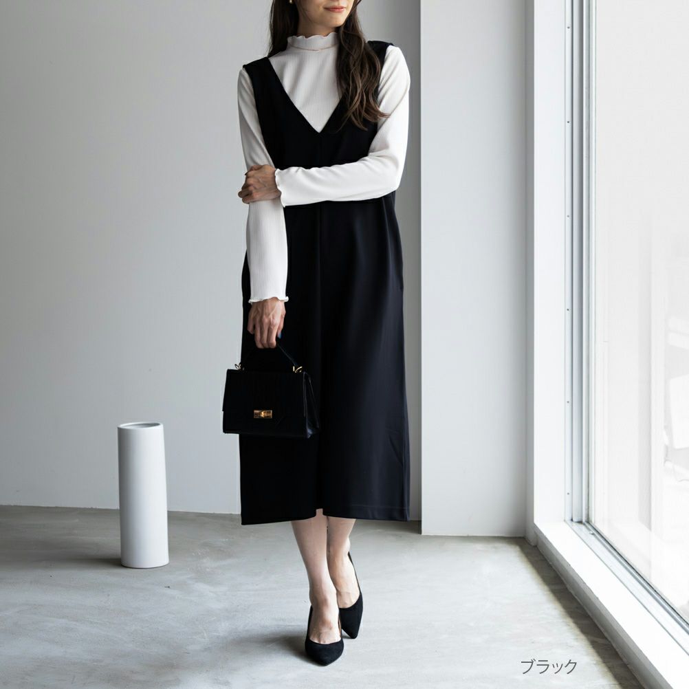 ジャンパースカートは、トレンドのVネックデザインで首元スッキリ。