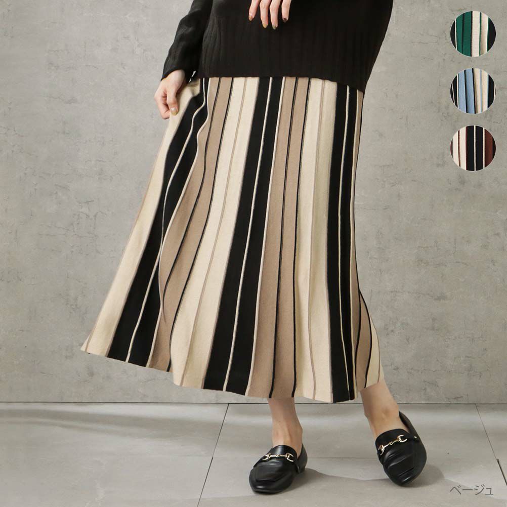 ネイビー フレアスカート 裏地付き ストライプ ライン 配色切替 ウエストゴム ウエスト紐 マルチストライプ ロングスカート