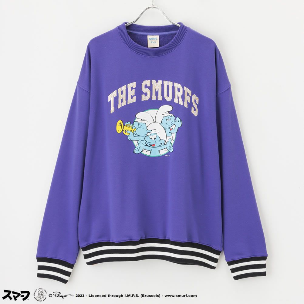 スマーフのキャラクター達が楽しげなカレッジ風トレーナー。