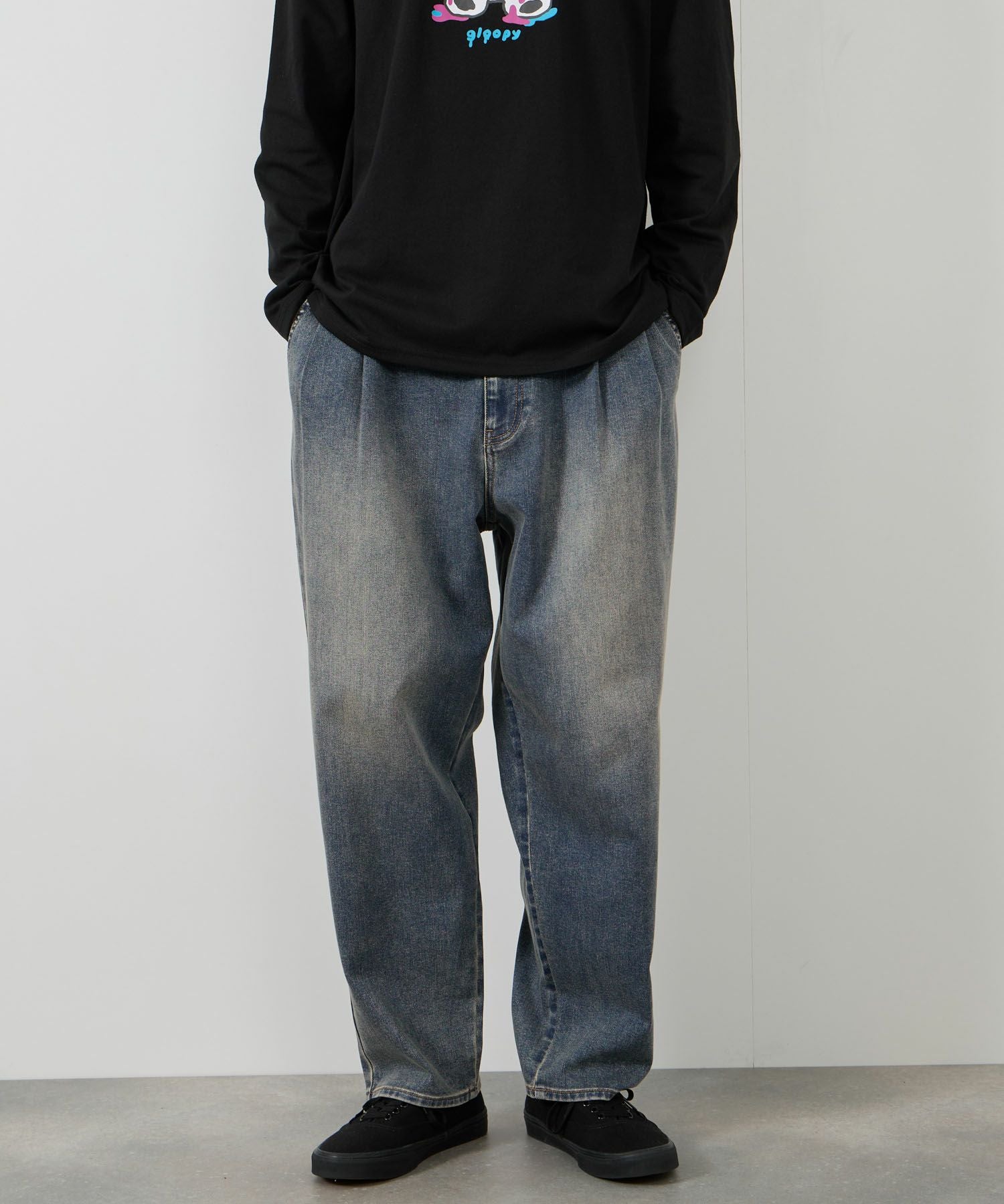 ゆったりとはけるようにウエストにタックデザインを施したワイドテーパードデニムパンツ。