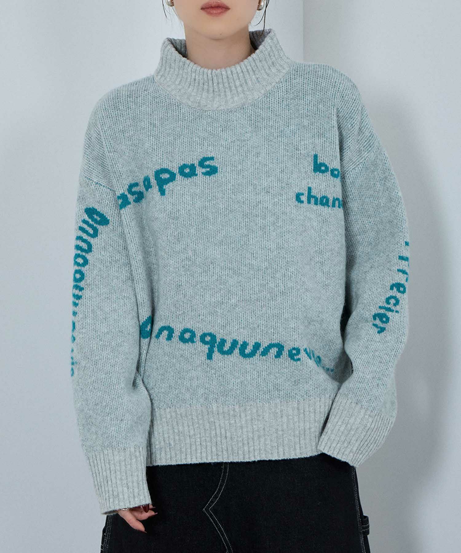 ネイビー ニット セーター ふんわり 軽い ゆったり ロゴ 総柄 プリント 長袖 ハイネック プルオーバー