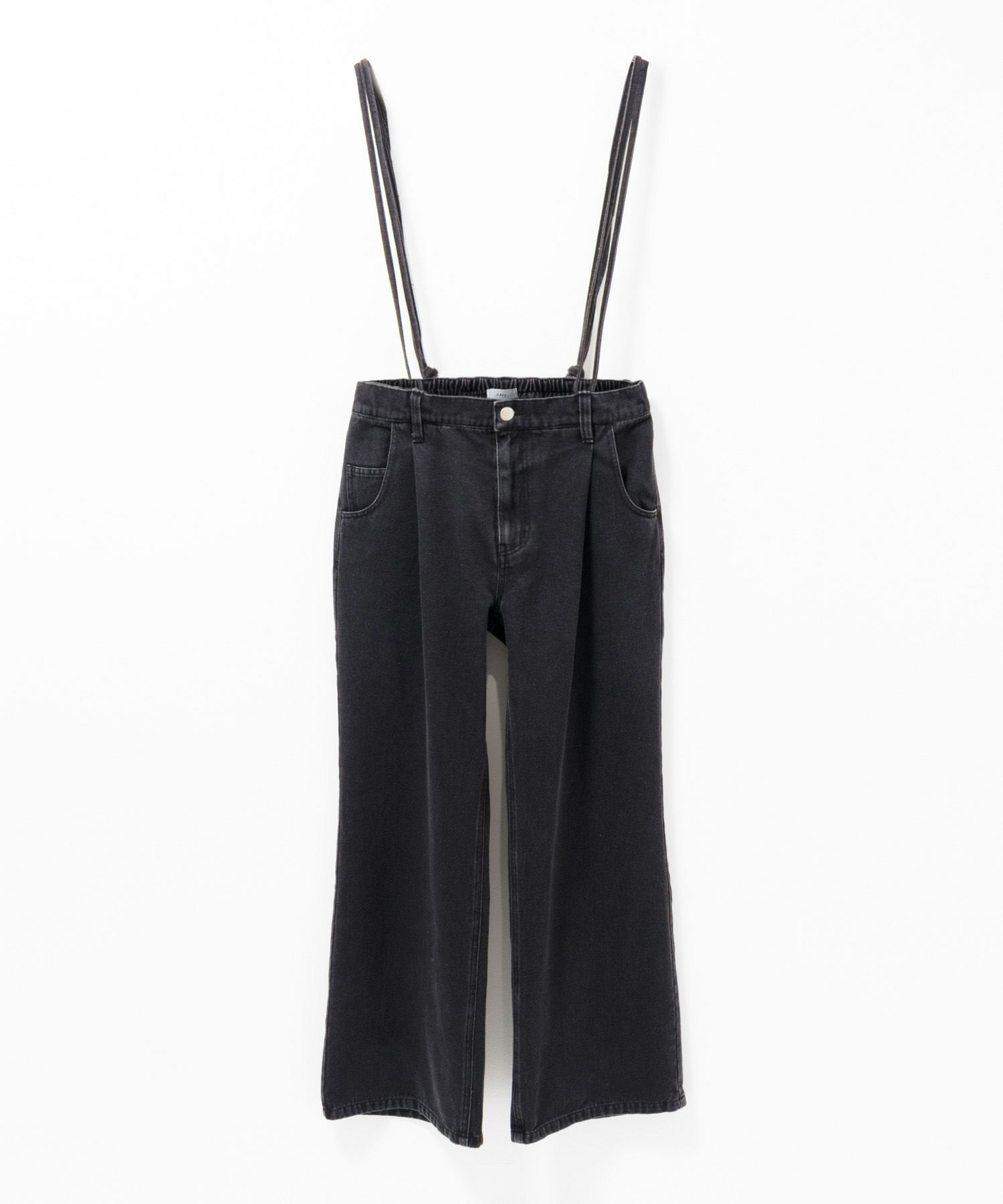 長さ調節可能な肩紐付きデニムワイドパンツ。