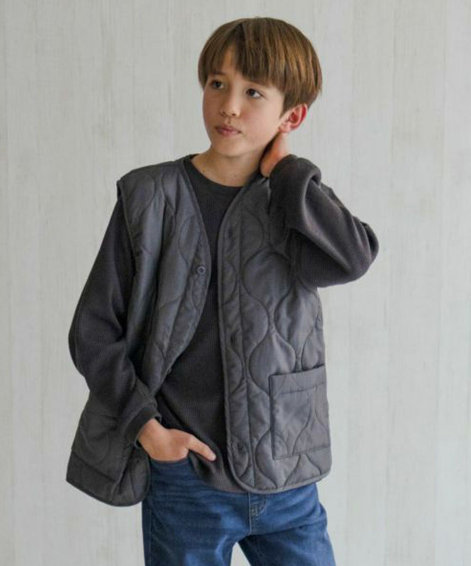 トレンド感もあるキルトベストにインナーとして使いやすいロンTをセットにしました。