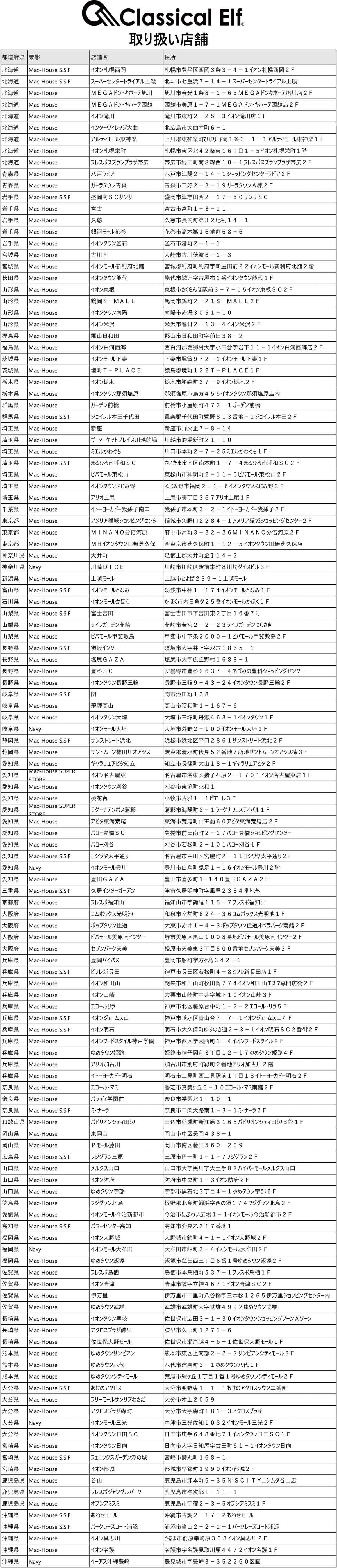 Classical Elf 取り扱い店舗