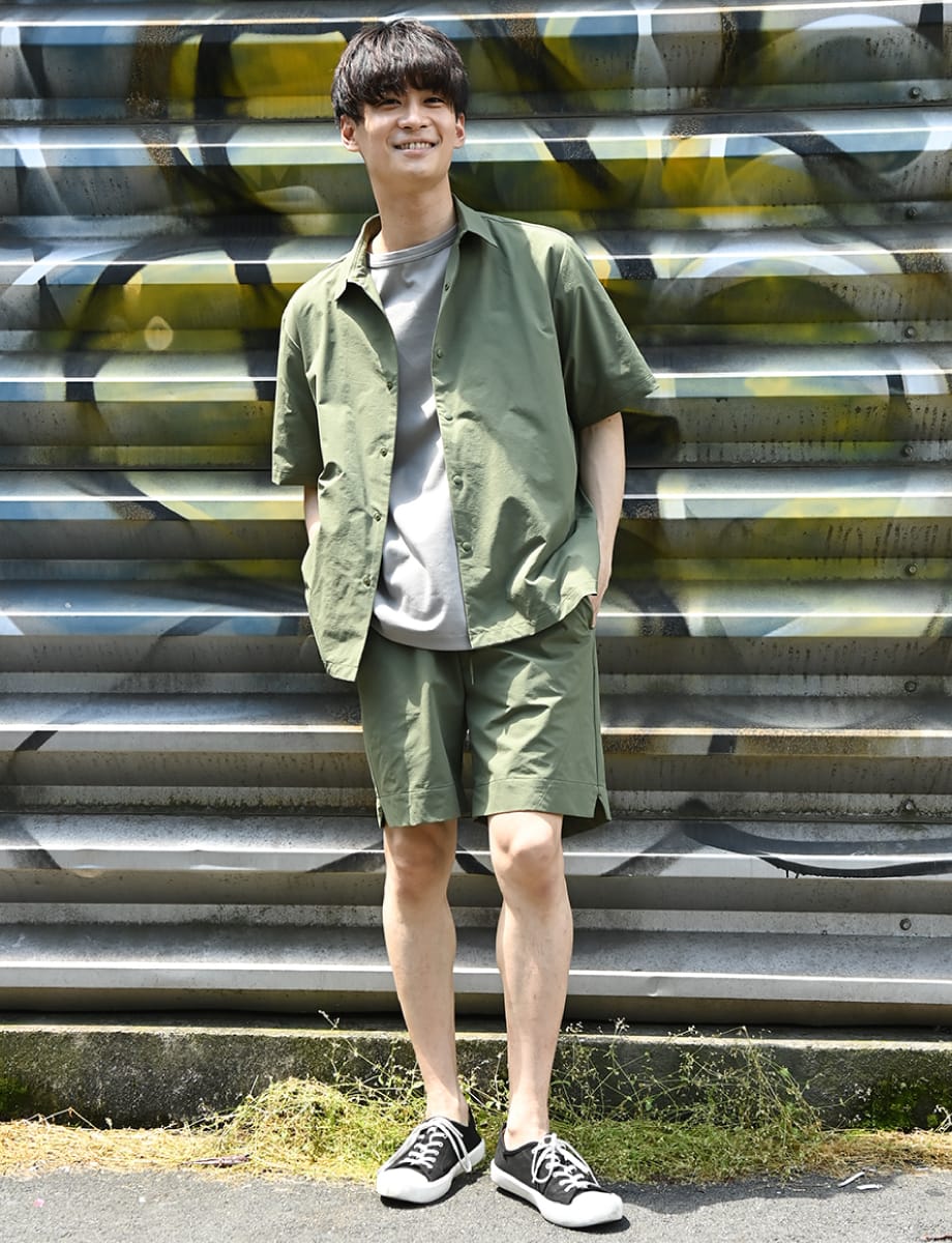 ラフな印象のショートパンツは、シャツとのセットアップでキレイめに仕上げる。