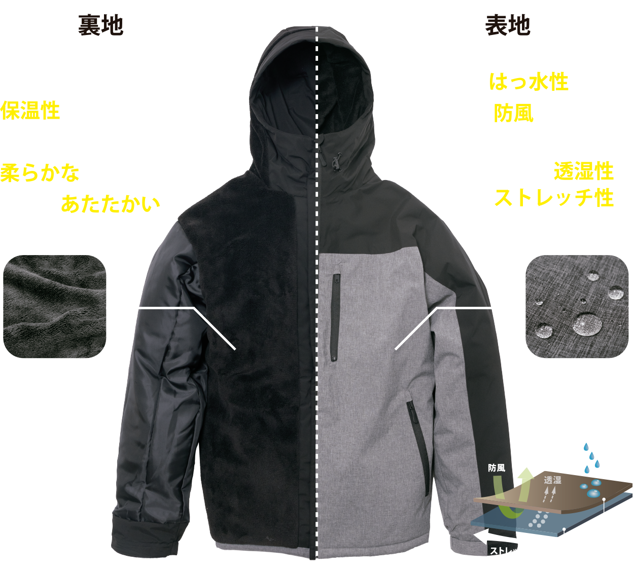 表地で雨や冷たい風をシャットアウトし、裏地でしっかり保湿する。